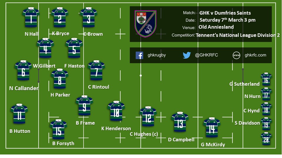 The GHK 1st XV to play Dumfries in another important Tennent’s National League Division 2 match at Old Anniesland on Saturday 7th March, kick off 3 pm is