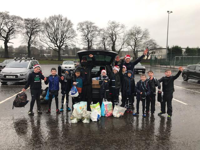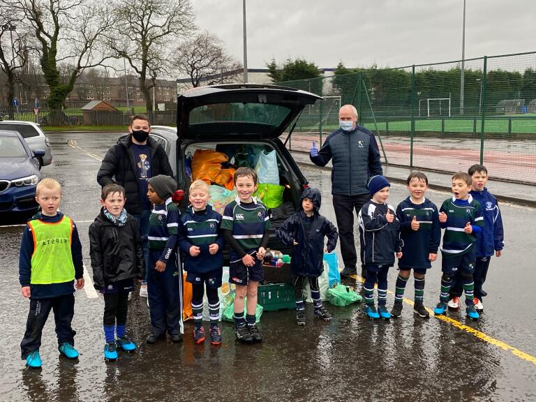 GHK Club President Ewan Cameron, player Craig Gossman and some wet but happy P3s with one of the car loads of Foodbank donations. P4s to the fore as they finish their last training session of the year.